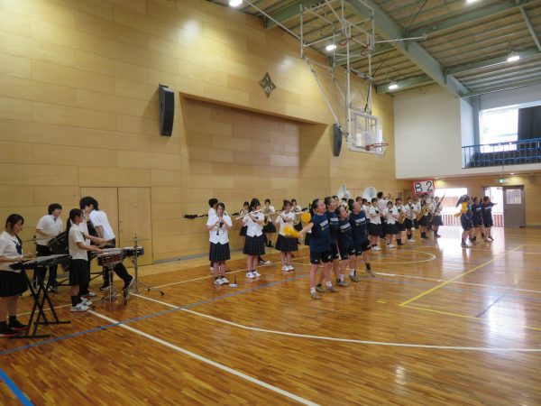 応援練習は体育館Aにて、応援指導部・吹奏楽部・チアダンス部の生パフォーマンスに合わせて行われました。応援指導部の生徒の解説を聞き、チアダンス部のお手本を見ながら、メガホンを使って応援の際の振り付けや掛け声など、横浜高校伝統の応援を練習していきました。また、それぞれの応援歌ごとの練習が終了すると仕上げとして、応援団長の合図のもと、生徒会本部役員の生徒が曲名の書かれたプラカードを掲げ、本番と同じような形式での通し練習も行われました。