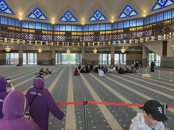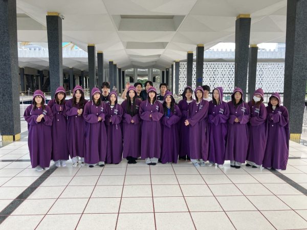 終日クアラルンプール(KL)市内観光。「多文化が見える都市KLを巡る」では【バドゥ洞窟】、【国立モスク】、【チャイナタウン】、【メルデカスクエア】を巡りながら現地の人たちに質問し、多文化共生についての考えを深めるミッションが与えられました。モスクでは肌の露出がNGのため、女子はイスラム衣装を着用しています。最後に【ペトロナス・ツインタワー】を見学して、一人ずつミッションゴールを発表しました。