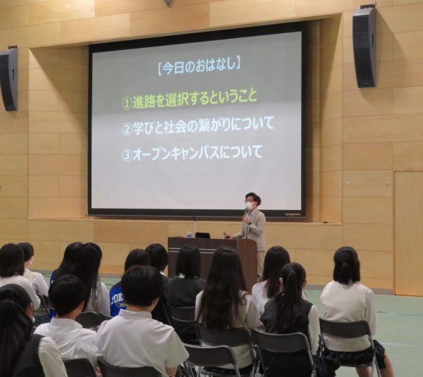 1校時はマイナビの講師の先生をお招きし、進路に関する講義を聞きました。高校卒業後の進路選択の重要性や、オープンキャンパスに行く意義などを学ぶことができました。