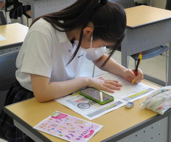2校時は各教室でワークブックに取り組みました。始めに、マイナビ進学WEBを参考にして自分の興味・関心のある分野を挙げ、その分野に関する学問について学びました。そして、その分野からどのような学びを得て、どのような業界につながるのかを各自まとめていきました。最後に、具体的な進路を考えるため、大学や専門学校のパンフレットの取り寄せを行いました。皆真剣に自分の進路について考えている様子で、ワークブックに集中して取り組んでいました。