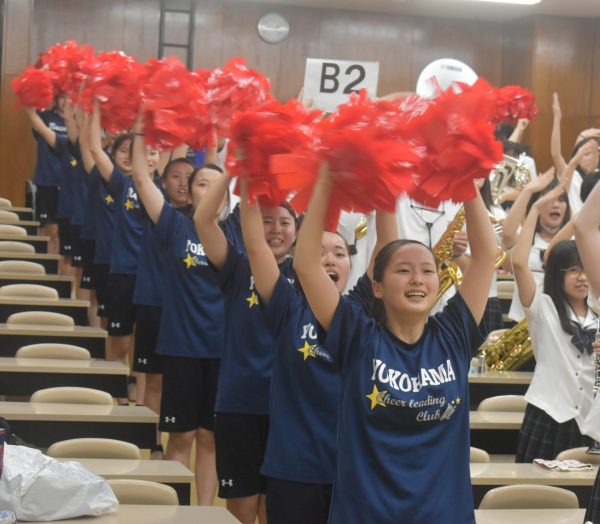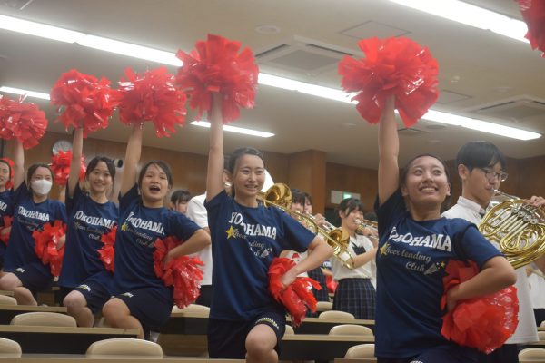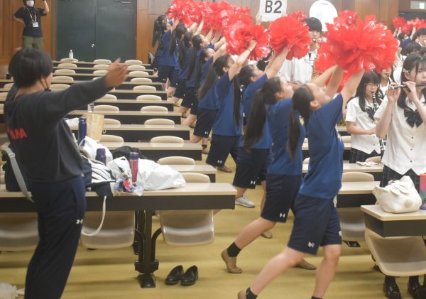 応援指導部の指揮のもと、吹奏楽部の演奏にあわせ、チアダンス部がキレのあるダンスを踊りました。