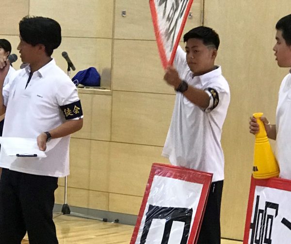 司会進行は生徒会役員。野球応援の際には、応援席に次の曲を指示するボードを掲げます。