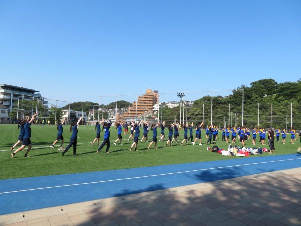 グラウンドや体育館で応援曲の通し練習を行っています。