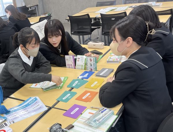 第一学年は14日の前半に「ライフプランゲーム」を各クラスで行いました。このゲームは、人生を歩んでいく上でどのようなお金の使い方を選択するか、そして、その選択がどのように資産形成に影響を与えるかなどを、カードゲームを通して学ぶものです。
