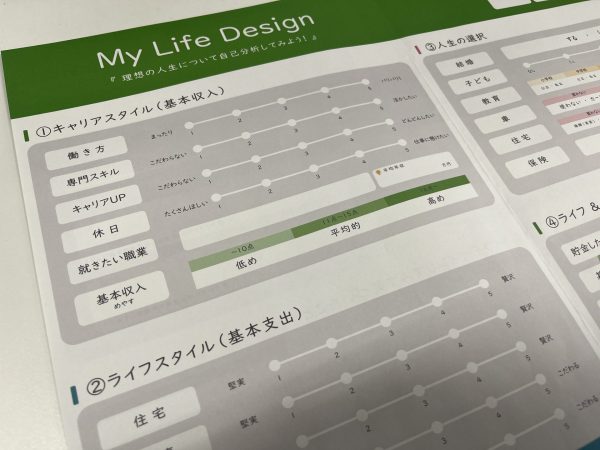 第二学年は14日に事前学習「My Life Design『30代までのライフデザイン』」を各クラスで行いました。この事前学習は、生徒ひとりひとりが自分の能力や希望する職業、生活レベルを踏まえて、自分が将来望むキャリアスタイルやライフスタイルを、ワークシートを通して考えるというものです。