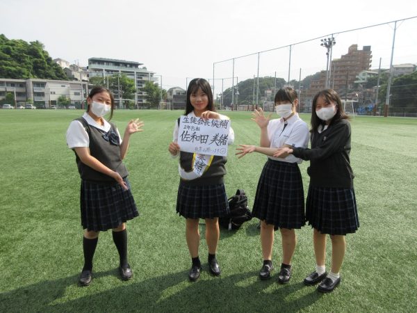 各候補者は、投票日まで校門で全校生徒に向けて挨拶運動をおこないました。また、YouTubeを用いた演説では、「笑顔溢れる学校づくりをするために自分が象徴になりたい」、「毎日学校に来たいと思える学校にしたい」と全校生徒に投げかけました。なかには、「生徒の意見を聞くためにアンケートを実施します」と具体的な取り組みを話す立候補者もいました。