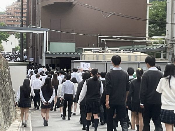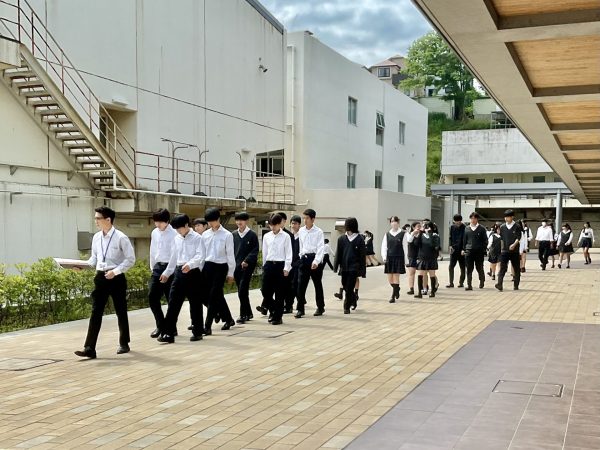 5月22日(水)一校時に、本年度第1回目の中高合同防災訓練がおこなわれ、各教室から第1グラウンドへの避難経路を確認しました。