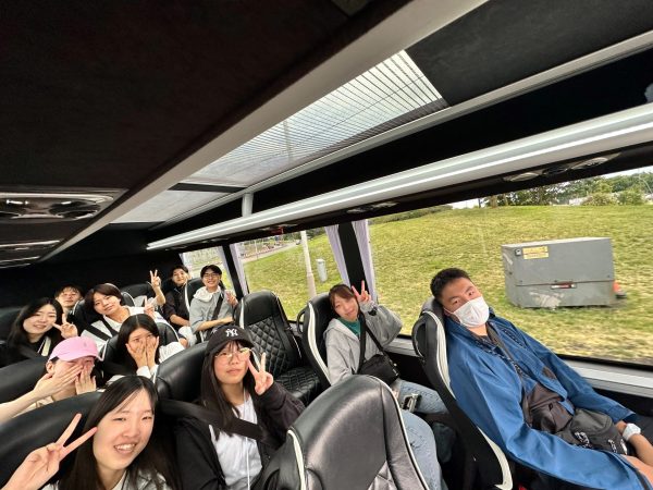 長時間のフライトの疲れも見せず,みんな元気!入国審査を(なんとか無事に)済ませ,バスで研修地Rochester Kings Schoolに向かっています。
